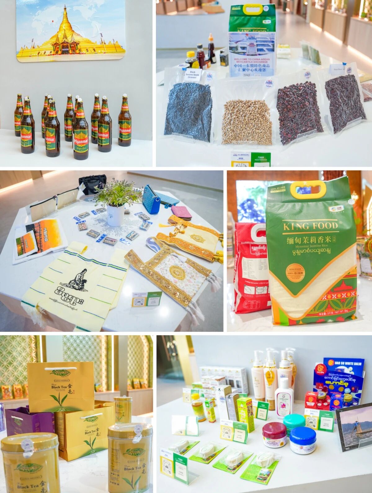 緬甸主題館內(nèi)展示了啤酒、茶葉、木偶奶茶、香米等多款特色商品,加之獨(dú)具當(dāng)?shù)靥厣恼故九_(tái),它們共同為我們打開(kāi)了一扇感知緬甸民俗風(fēng)情的窗口。
